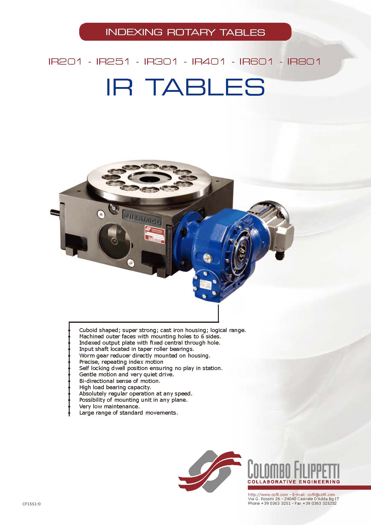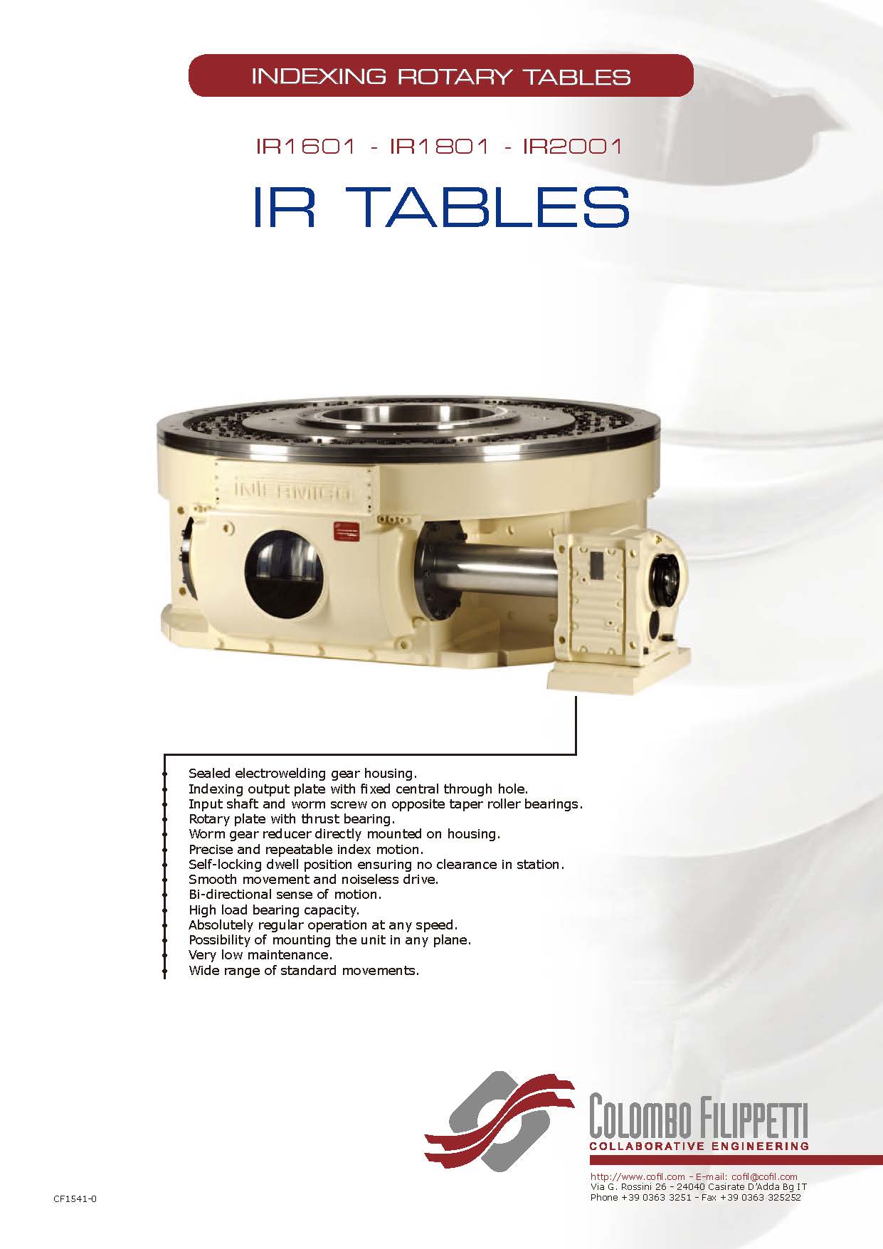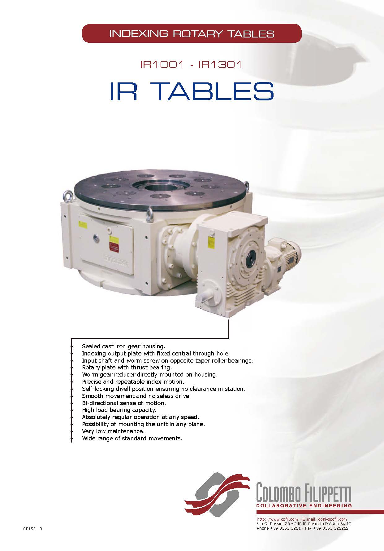 COLOMBO FILIPPETTI spa "IR" Minindex 系列的分度轉(zhuǎn)臺是圓柱形凸輪機械裝置,可將輸入軸的勻速旋轉(zhuǎn)運動轉(zhuǎn)換為輸出表盤的分度旋轉(zhuǎn)運動。