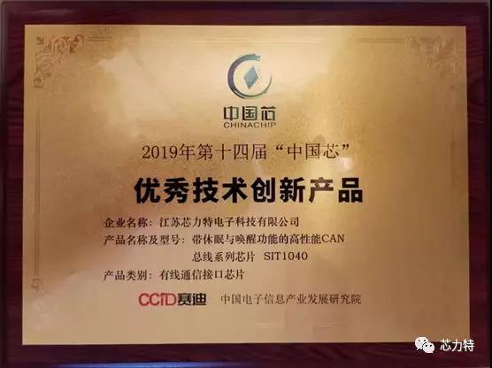 2019年10月25日,“中國(guó)芯”第十四屆集成電路產(chǎn)業(yè)促進(jìn)大會(huì)在青島舉行。在會(huì)上公布了“中國(guó)芯”優(yōu)秀產(chǎn)品征集的結(jié)果。芯力特有線通信接口芯片:帶休眠與喚醒功能的高性能CAN總線芯片SIT1040,榮獲“優(yōu)秀技術(shù)創(chuàng)新產(chǎn)品”,是本次“中國(guó)芯”大獎(jiǎng)評(píng)比在有線通信接口領(lǐng)域僅有的1顆獲獎(jiǎng)芯片!