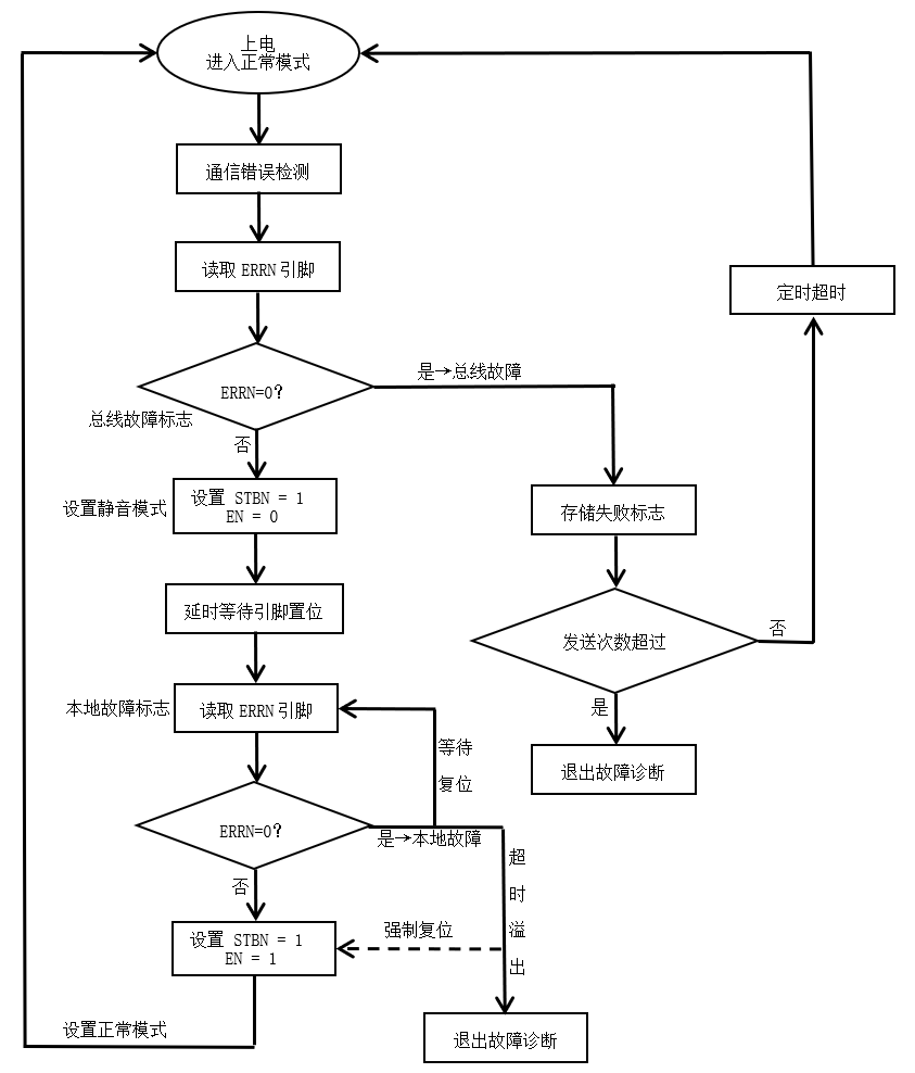 ECU節點上電啟動后SIT1043Q進入正常模式,在正常模式下MCU微控制器通過讀取引腳ERRN電平,來進行總線故障診斷。如果獲取到ERRN=0,則通信故障是由總線故障引起,MCU控制器置位總線故障通信失敗錯誤標志。如果獲取到ERRN=1,則控制器復位總線故障通信失敗錯誤標志。這時如果MCU控制器強制SIT1043Q進入到靜音模式,在靜音模式下,如果控制器獲取到ERRN=0,則可以診斷位本地故障。如果進一步獲取本地故障的哪一個類別(比如TXD顯性超時或總線顯性超時),可以由控制器操作RXD=0&TXD=1或者RXD=1進一步識別。