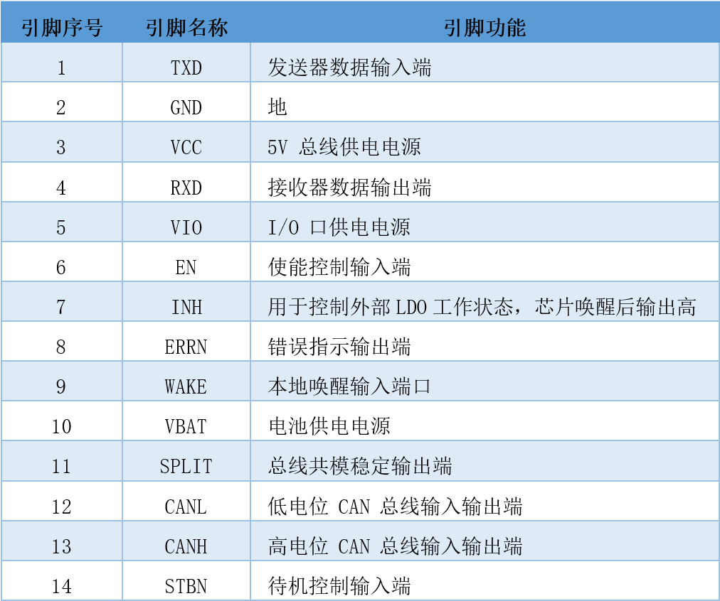 采用5V主供電VCC,VBAT輔助睡眠供電,支持IO口3.3V/5V 微處理器(MCU)直連,支持車載12V或 24V電源系統。