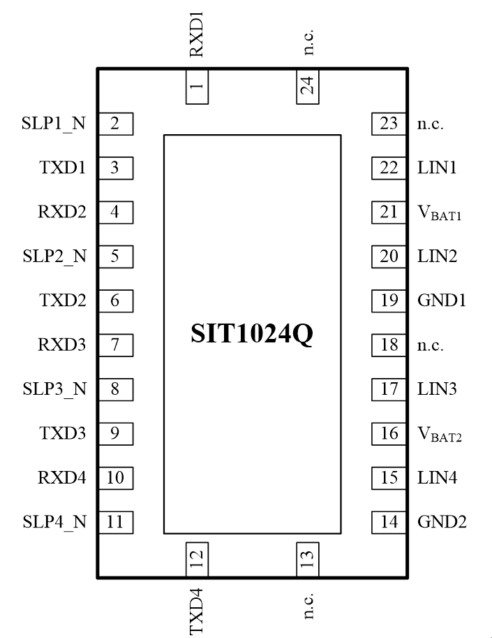SIT1024Q是一款四通道本地互聯網絡(LIN)物理層收發器,符合LIN 2.0、LIN 2.1、LIN 2.2、LIN 2.2A、ISO 17987-4:2016 (12V) 和SAE J2602標準。主要適用于使用1kbps至20kbps傳輸速率的車載網絡。SIT1024Q通過TXDx引腳控制 LINx總線的狀態,可將協議控制器的發送數據流轉換為具有最佳壓擺率和波形整形的總線信號,以最大程度地減少電磁輻射發射(EME)。LIN總線輸出引腳具有內部上拉電阻,僅當用作主機節點時,才需將LIN總線端口通過一個與二極管串聯的外部電阻上拉至VBATx。SIT1024Q通過LINx引腳接收總線上的數據流,并由接收器的輸出引腳RXDx將數據傳送到外部的微控制器。