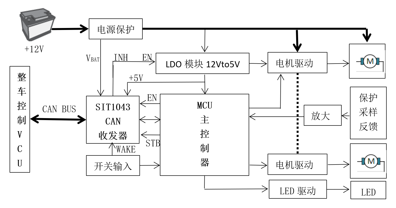 ECU最常見的有:EMS(Engine Mangement System)發動機管理系統,TCU(Transmision Control Unit)自動變速箱控制單元,BCM(Body Control Module)車身控制模塊,ESP(Electronic Stability Program)車身電子穩定控制系統,BMS(Battery Management System)電池管理系統,VCU(Vehicle Control Unit)整車控制器等。隨著ECU控制范圍已經擴張到巡航控制、燈光控制 、安全氣囊控制 ,懸架控制 、燃油加熱控制、排氣控制、制動控制、EGR和增壓壓力控制等等。下面我們來介紹SIT1043Q在車門控制模塊中的應用。在汽車車門模塊設計中,其技術需求: