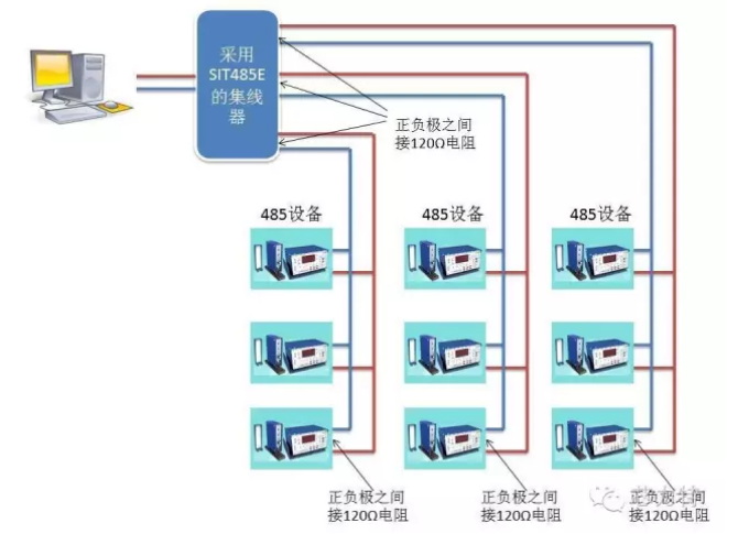 采用星形結(jié)構(gòu)的RS485總線拓撲如圖3所示,這種結(jié)構(gòu)要注意在集線器的每一對458+,485-端口加120Ω的終端匹配電阻。